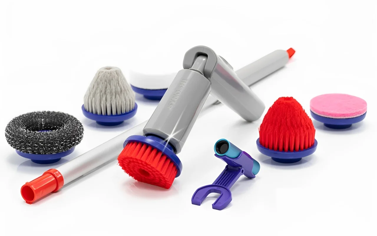 O dispositivo possui um design inovador em forma de L. A cabeça da escova é fixada na extremidade pontiaguda. É possível utilizar as sete cabeças de escova incluídas na caixa para limpar um vasto leque de superfícies, garantindo praticidade e eficiência em qualquer tipo de limpeza.